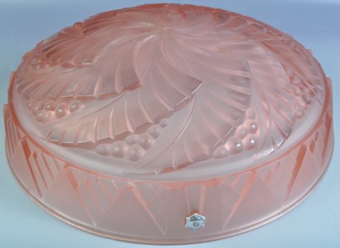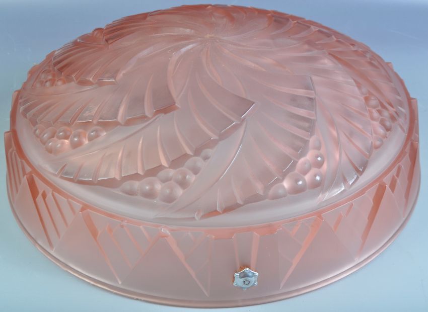 A vintage early 20th Century French Art Deco thick cut glass pink ceiling light hanging shade flycatcher of circular form. Cut geometric pattern cut glass rim with swirl like decoration to the centre. Measures approx 14cm x 40cm diameter.