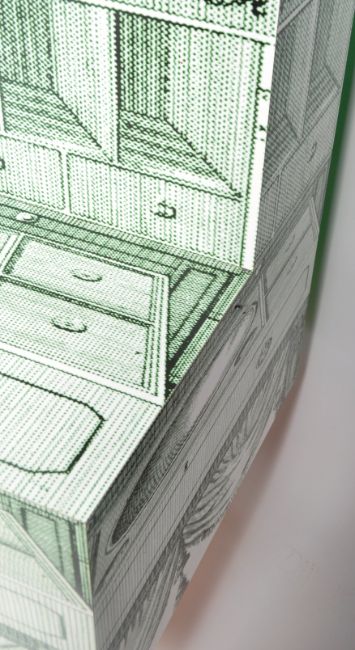 A matching pair of contemporary quality laminated Hollywood Regency shop haberdashery display advertising point of sale / event stand of L-shape form. The display unit having a thick applied green laminate mimicking a Victorian dressing table / washstand with curtains detailing below. All being raised on screw polished metal leg supports. Each measures approx 116cm x 110cm x 78cm.