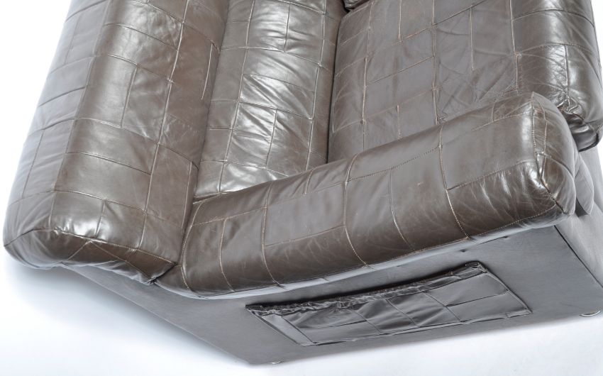 Lebus - A retro vintage 20th Century High End British Design Brazilian patchwork hide three seater sofa settee of straight rectangular form having cushioned backrest and seat pads. Upholstered in a patchwork dark brown leather with all being raised on chromed metal supports. Measures approx 76cm x 200cm x 91cm.