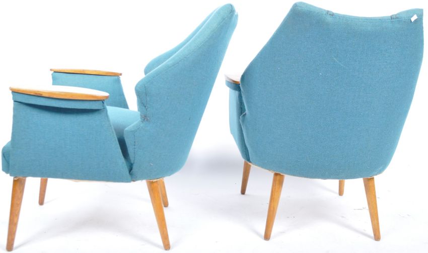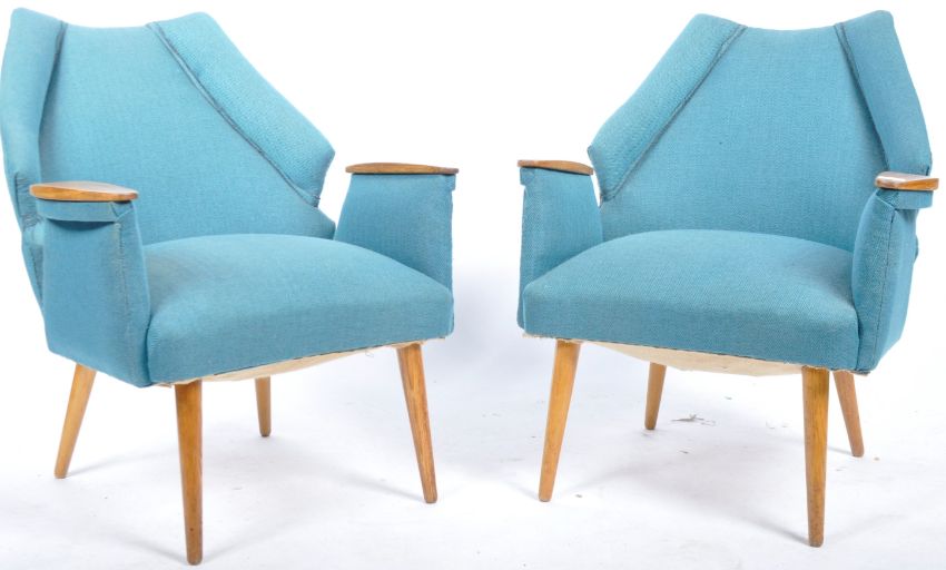 Believed Miroslav Navratil - A matching pair of retro vintage 20th Century Czechoslovakian oak framed easy / lounge chair / fireside armchairs. Each chair having shaped wingback backrest with show wood oak armrests and sprung seat pads. Each being upholstered in a blue fabric and raised on splayed tapering oak leg supports. Each chair measures approx 84cm x 71cm x 67cm.