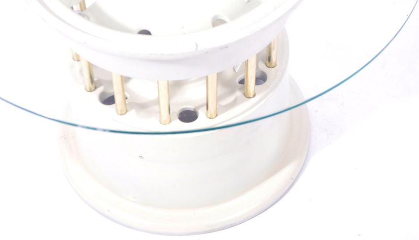 An industrial aviation bespoke coffee table / side occasional table made from the main landing wheel / undercarriage wheel of a Tornado Jet Fighter set with a circular glass top. Impressed marks to the rim itself and being finished in white. Measures approx 43cm x 70cm diameter.