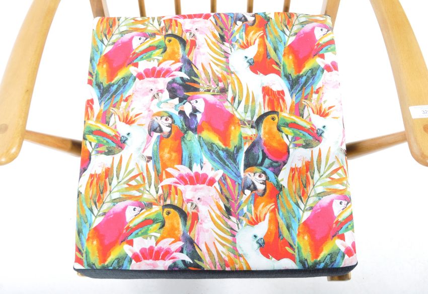 Lucian Ercolani - Ercol - Model 567 - An original retro vintage 1960's beech and elm easy armchair / arm chair or lounge chair having an upholstered tropical bird print cushion seat and back with new Pirelli webbing. Measures approx; 77cm x 68cm x 60cm.