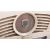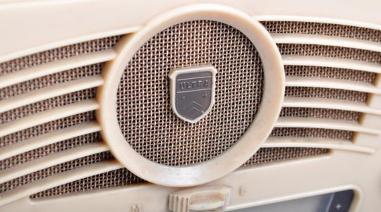 Ultra - A retro vintage early to mid 20th Century brown and cream bakelite cased portable radio music player having a carrying handles atop with dials and viewer to the front. Measures approx 21cm x 30cm x 15cm.