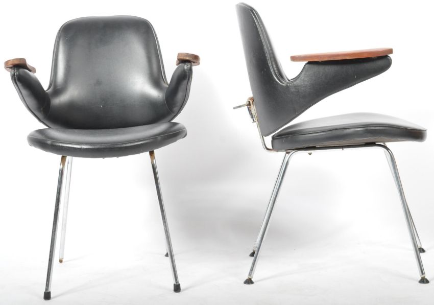 A set of five retro vintage 20th Century black vinyl, teak & chrome dining chairs / desk armchairs in the manner of the Pelican Chair by Louis van Teeffelen. Each having an adjustable lean back backrest with teak show wood arms and cushioned seats. All raised on chrome tubular legs. Measures approx; 83cm x 59cm x 50cm.