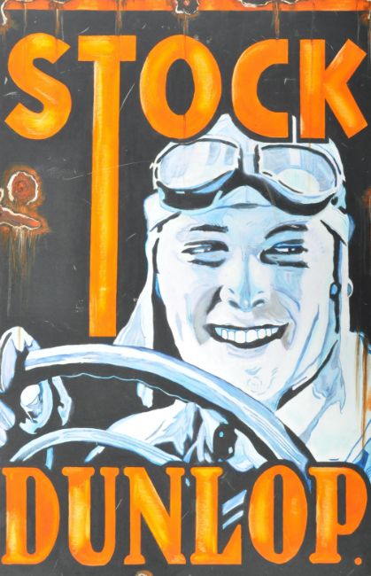 Stock Dunlop - A 20th Century oil on canvas painting artist's impression of a traditional vintage advertising enamel sign. Of motoring interest - Stock Dunlop tyres - Large orange font depicting a classic British racing driver with helmet and goggles on a black background. Measures approx. H76cm x 51cm