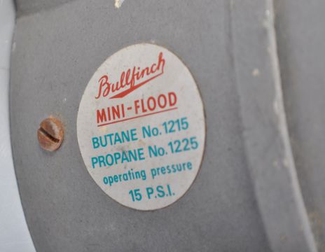 Bullfinch - Mini-Flood - A retro vintage mid 20th Century English gas exterior wall fitting lamp light having a grey painted metal circular case with a stepped glass panel front. Makers label to the side. Measures approx 22cm x 18cm x 17cm.