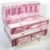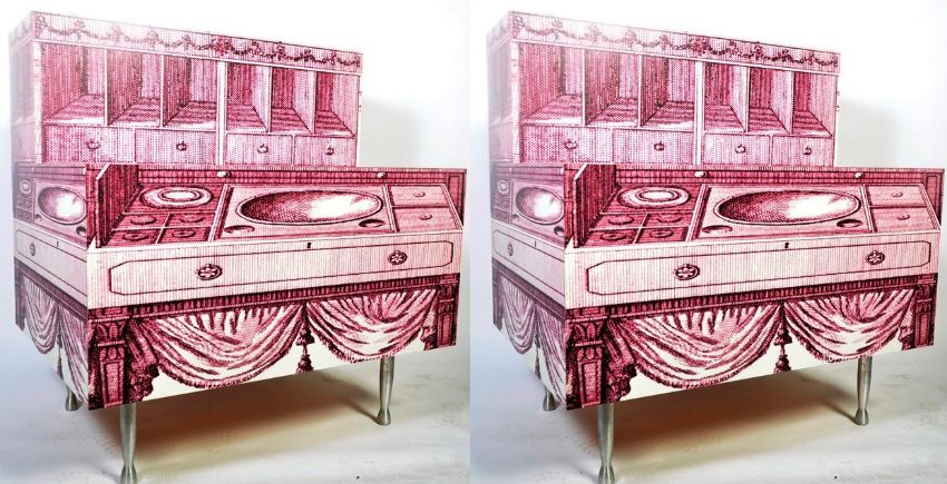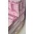 A matching pair of contemporary quality laminated Hollywood Regency shop haberdashery display advertising point of sale / event stand of L-shape form. The display unit having a thick applied pink / purple laminate mimicking a Victorian dressing table / washstand with curtains detailing below. All being raised on screw polished metal leg supports. Each measures approx 116cm x 110cm x 78cm.