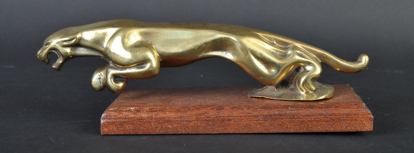 Jaguar Car Mascot - an unusual original vintage mid 20th century cast bronze Leaper Jaguar car mascot. Typical form, similar to a Type 1 mascot. Unknown origin / maker. Mounted on a wooden display base. Nose to tail 20cm. (53)