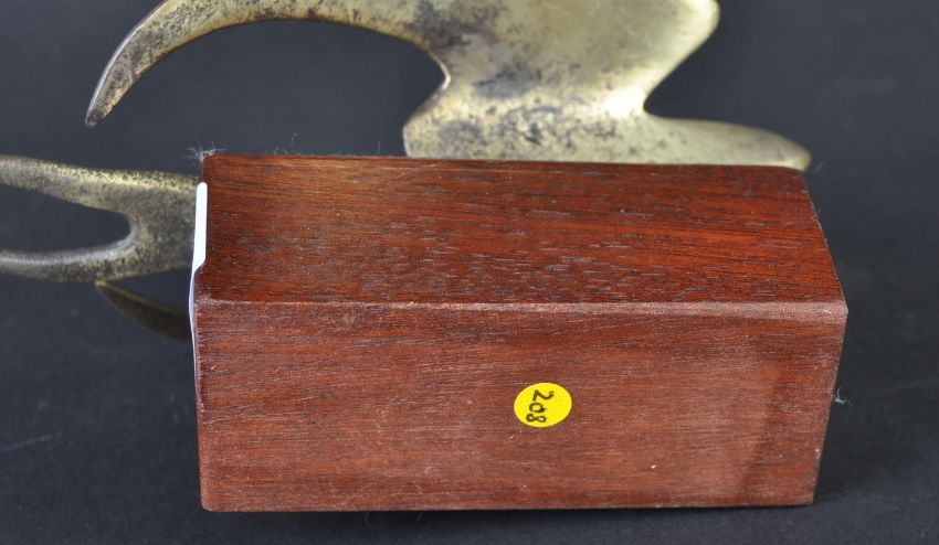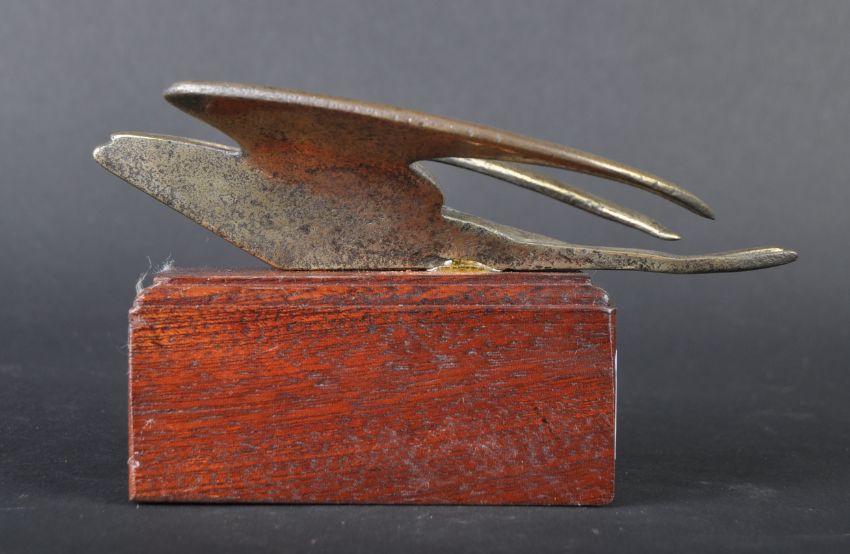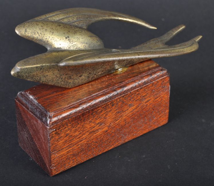 Car Mascot - an original mid 20th century car bonnet mascot in the form of a Swallow bird. Depicted in flight, with wings open and tail fanned. Mounted on a wooden display plinth. 14cm long. (208)