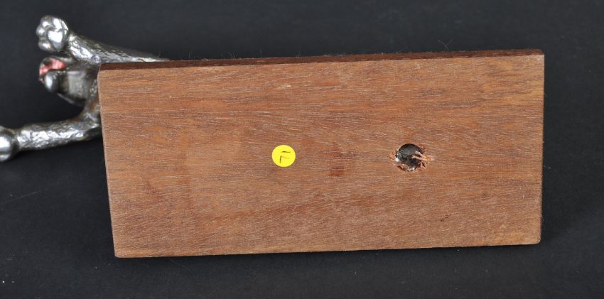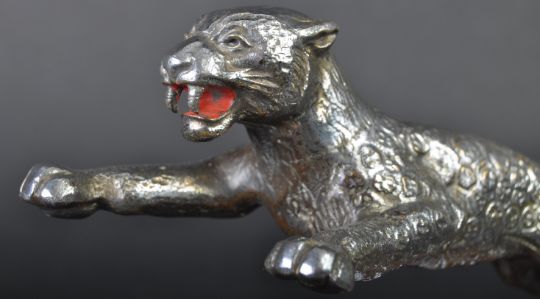 Desmo Car Mascot - an original c1950s vintage Desmo made leaping cat car radiator mascot. Nickel plated, with unusual painted red mouth, with a detailed body. Nickel plated, and mounted on a later wooden display plinth. Measures approx 19cm long.