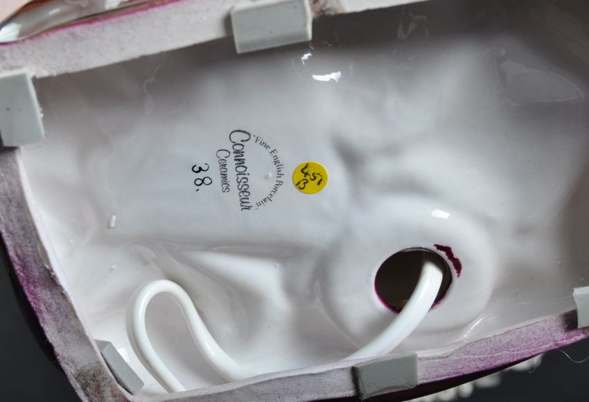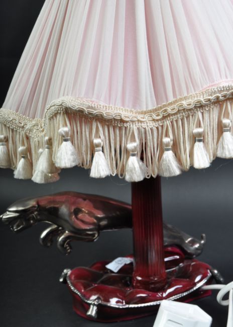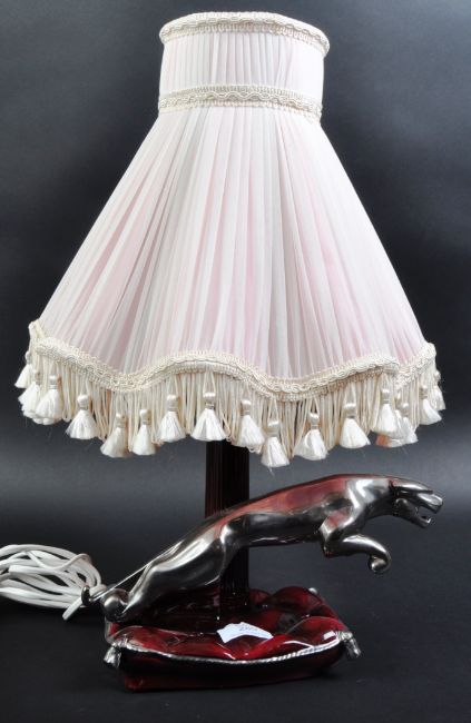 Jaguar - a scarce Connoisseur Ceramics made Jaguar themed ceramic porcelain lamp base. The lamp base in the form of a red cushion with a ceramic representation of a Leaper Jaguar car mascot to the side. With original shade. Maker's marks to base. Undamaged.