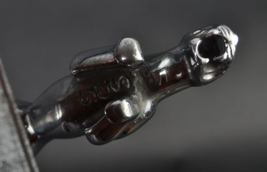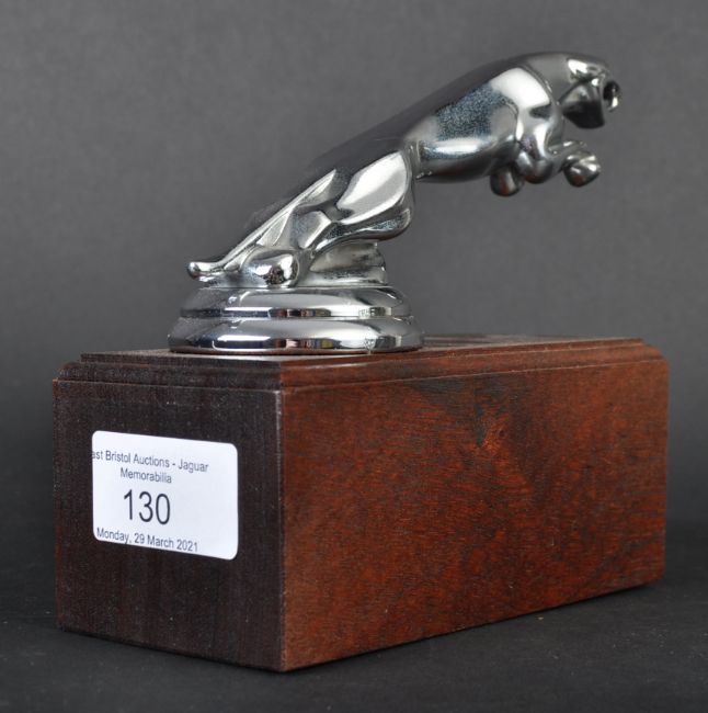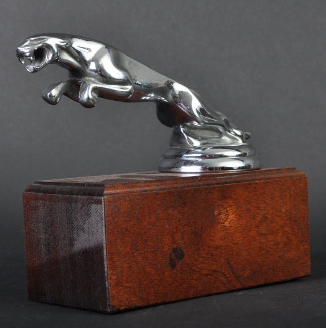 Jaguar Mascot - an original vintage chrome Jaguar Leaper car mascot. Removable form (to prevent theft). Typical form, with elongated body and open mouth. SDS maker's marks impressed to base. Mounted to a wooden display plinth. Nose to tail 13cm. (166)