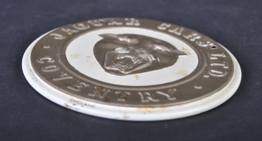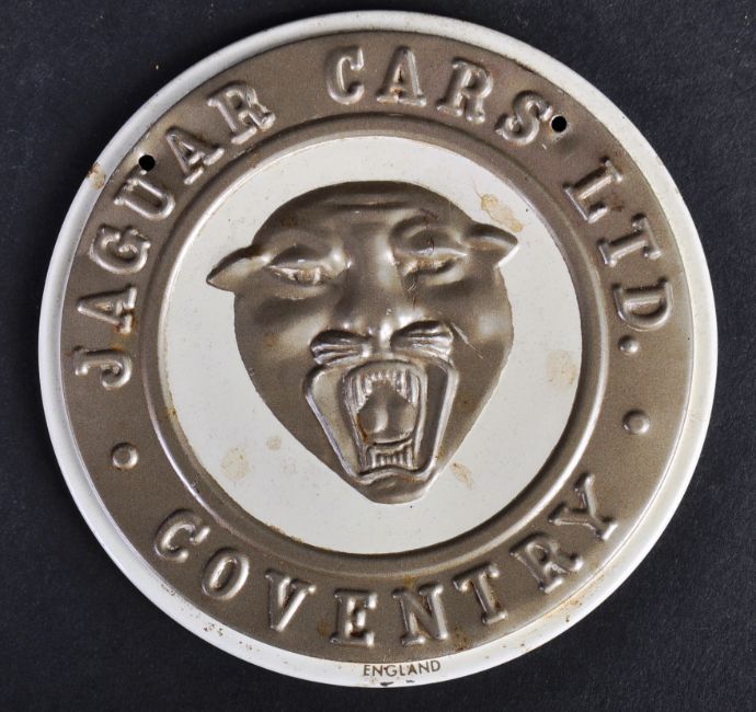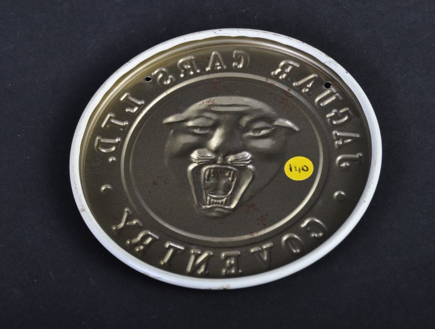 Jaguar - an original vintage c1950s American made Wheaties cereal promotional metal (tin) Jaguar mascot emblem. Pressed metal form, with white and gold painted detailing. Measures approx 9cm diameter. (140)