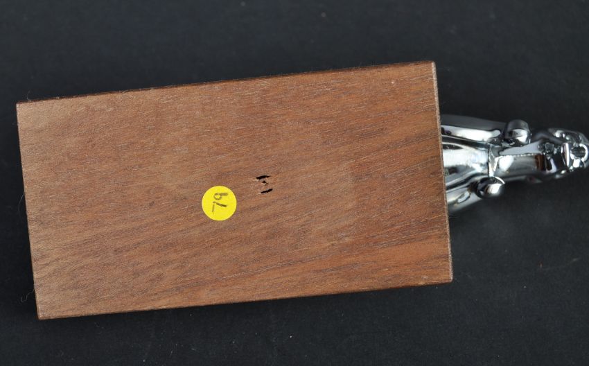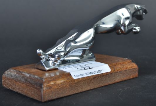 Jaguar Mascot - an original 20th century Jaguar made Leaper chrome car mascot. Smaller size, and similar to a Type 3 mascot with a smaller base. Believed to be made for the Scooter market. Mounted on a wooden display plinth. Nose to tail 12.5cm.