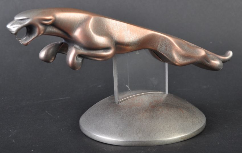 Jaguar Mascot - an original 20th century Jaguar type Leaper Mazac / Mazak car mascot in nickel, mounted on a perspex and brass display base. Unknown origin. Nose to tail 19cm. (184)