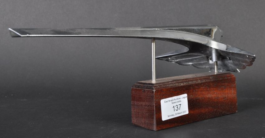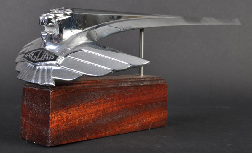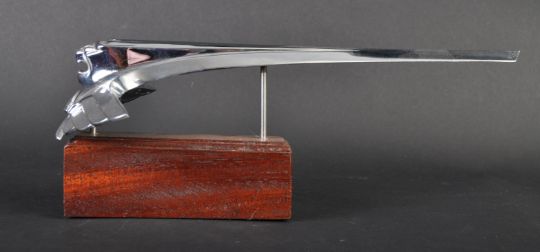 Jaguar Mk7 Grille Badge - an original c1960s later-version elongated Jaguar Mk 7 / VII bonnet / grille car badge / mascot. The badge forms to the shape of a Jaguar's head, with an enamel plaque beneath. Mounted on a wooden display plinth. 28cm long in total. (184)