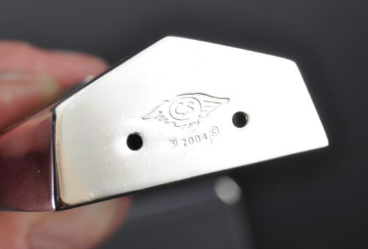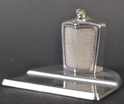 Jaguar - a c2004 Jaguar issued desktop pen tidy / pen holder in the form of a Jaguar SS radiator grill. The grill mounted atop a chrome plate with small slot for pens. Features a miniature Leaper mascot to the top. Measures approx 7cm tall. (291)