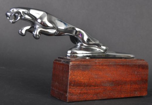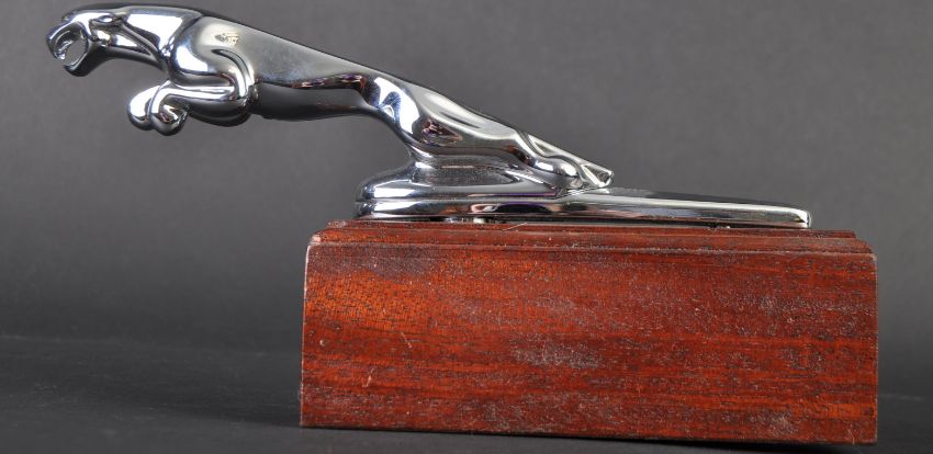 Jaguar Mascot - an original vintage chrome Type 5 'sprung' Jaguar car bonnet Leaper mascot. Typical form, with a shaped base. Mounted on a wooden display plinth. Nose to tail 15cm. (250)