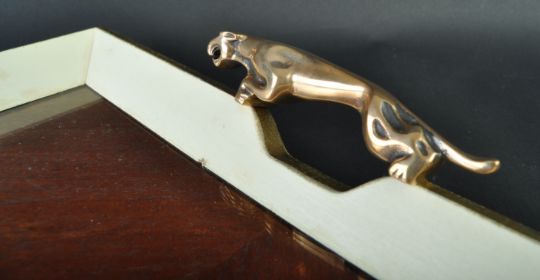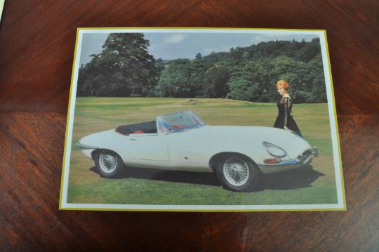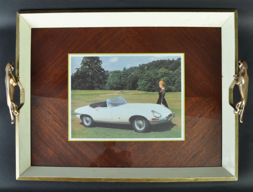 Jaguar - a rare c1960s Jaguar issued presentation tray, originally issued to celebrate launch of the E Type Jaguar. The tray of walnut veneered construction, with an E Type Jaguar print set under glass. Original bronze mascot Leaper handles to either side. Rare piece of Jaguar memorabilia - only issued by Jaguar directors to customers of interest / importance. The vendor has never found another in existence for the E Type. Measures approx 48cm long.
