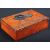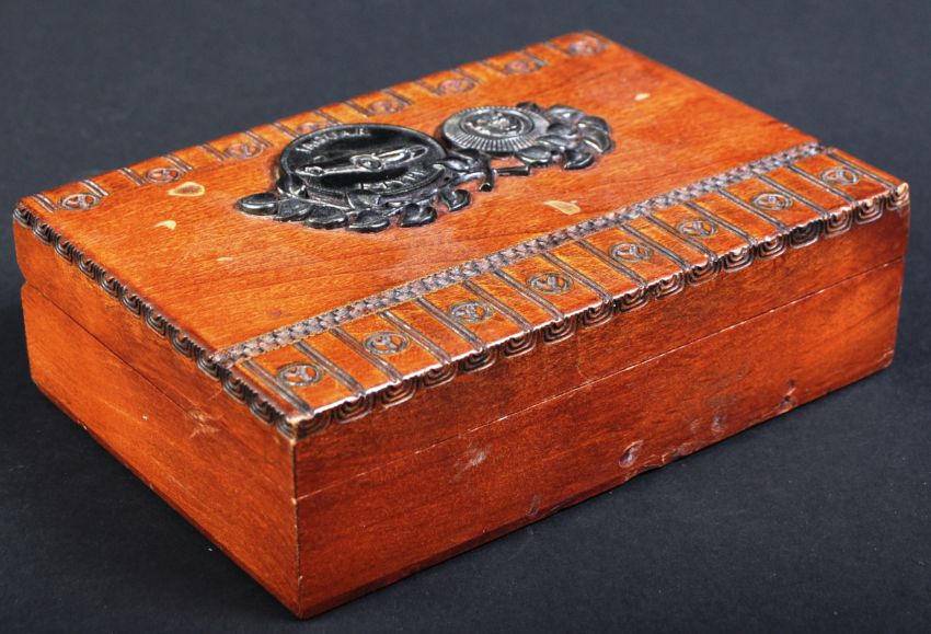 Jaguar - a vintage 20th century folk art style wooden box with E Type Jaguar emblems affixed to top. The box lid decorated with steering wheel motifs, and an E-Type Jaguar coin and mascot head to top. Possibly a cigarette box / cigar humidor. Measures approx 16cm long.