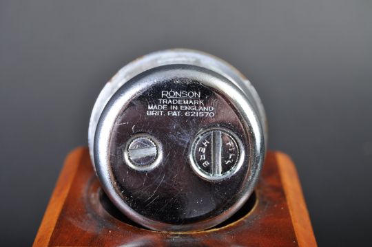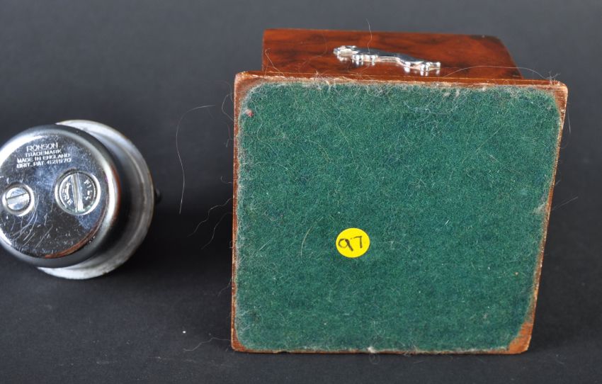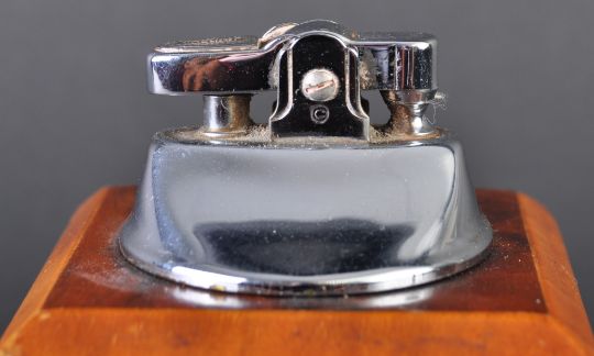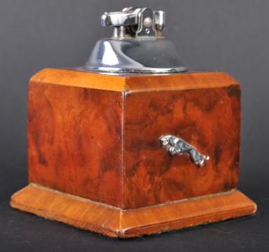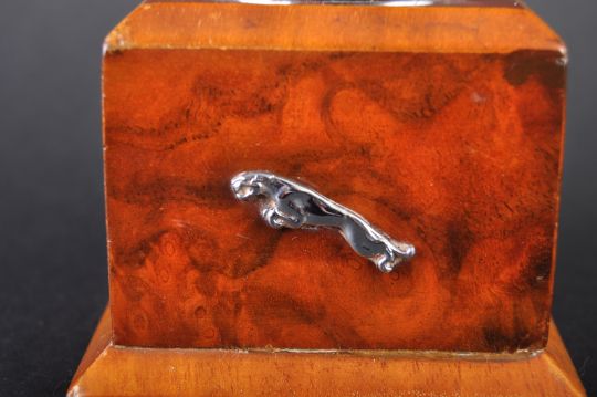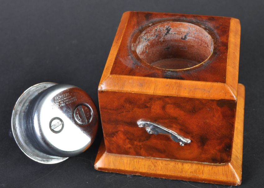 Jaguar - an original vintage c1960s Jaguar tabletop / desktop cigarette lighter. Walnut veneered mahogany construction, with a miniature chrome Leaper mascot. Ronson lighter to top. Made to giveaway to main dealerships and important customers. Measures approx 9cm tall. (97)