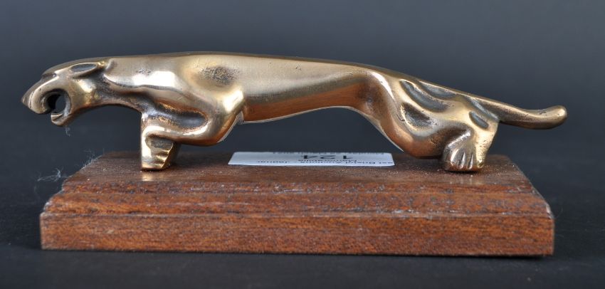 Jaguar - a vintage 20th century Jaguar type brass car bonnet mascot. Brass construction, clearly based on the original from Jaguar, but of unknown origin. Mounted on a wooden display base. 13cm.