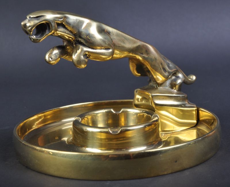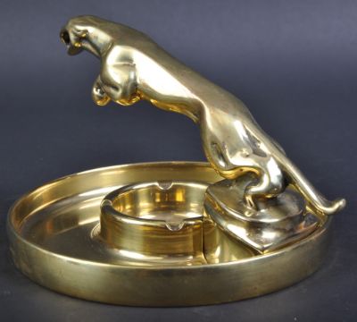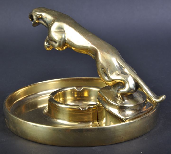 Jaguar - an original vintage 20th century Jaguar made leaper topped brass ashtray. Circular base, with a brass leaper mascot to top. With a central cigarette rest. Made as a promotional item for special customers / main dealerships. Measures approx 17cm diameter.