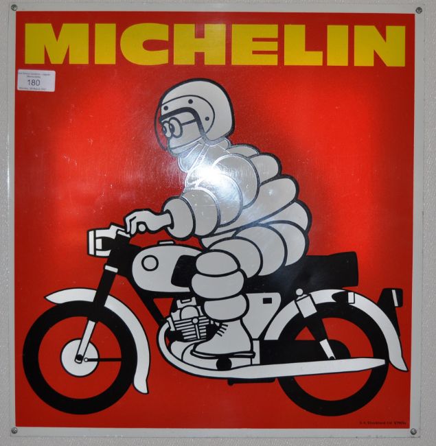 Michelin Tyres - an original vintage 20th century Michelin Tyres metal / enamel type advertising sign depicting the Bibendum mascot riding a motorcycle scooter. Red, with white border and text to top. Maker's marks for GA Shankland Ltd to corner. Measures 44cm x 42cm.