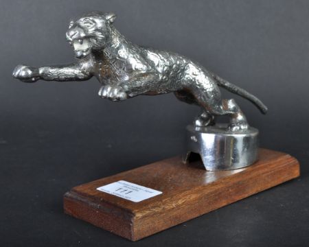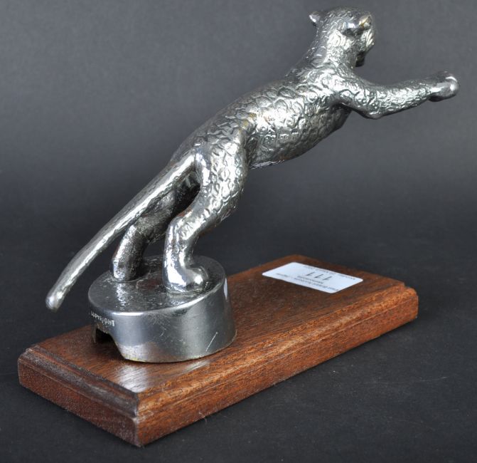 Desmo Car Mascot - an original 1930s vintage Desmo made leaping cat car radiator mascot. Chrome, with a separately moulded head section and detailed body. Mounted on a later wooden display plinth. Measures approx 19cm long.