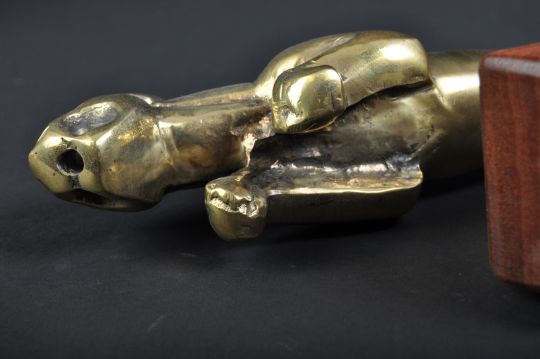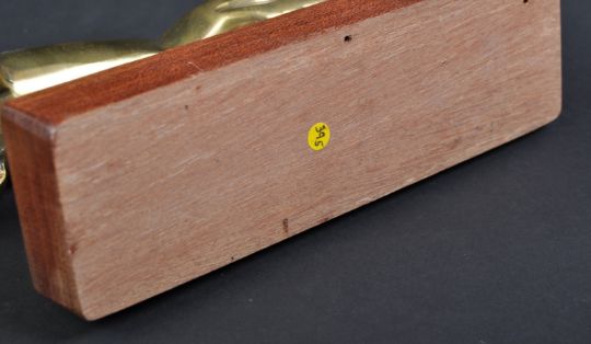 Jaguar Mascot - a 20th century vintage Jaguar Leaper car bonnet mascot, with retailers marks for Collins of London. Brass construction, and mounted on a later wooden display plinth base. Origin unknown. Nose to tail 29cm long. (395)