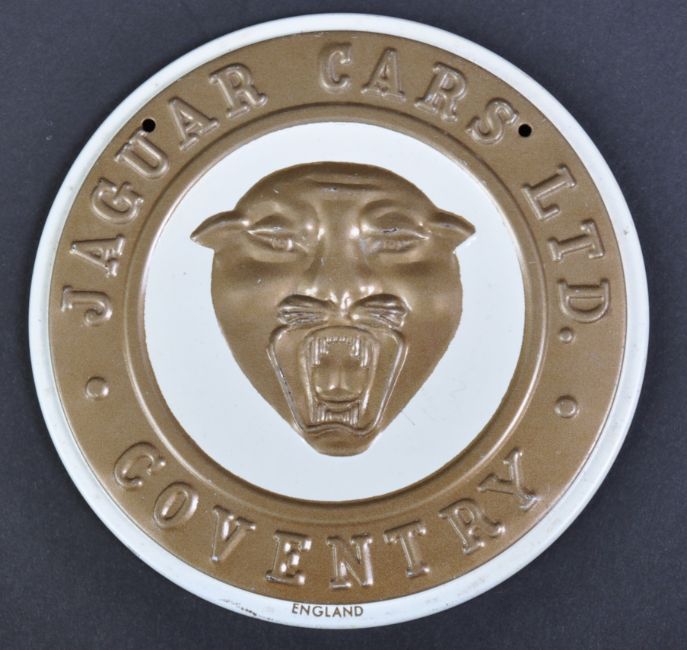 Jaguar - an original vintage c1950s American made Wheaties cereal promotional metal (tin) Jaguar mascot emblem. Pressed metal form, with white and gold painted detailing. Measures approx 9cm diameter.