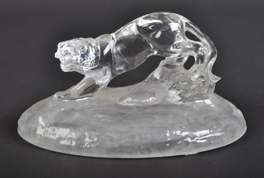 Jaguar - a 20th century moulded glass paperweight with prowling Jaguar to top. Loosely based on the famous Leaper mascot, and depicted atop a shaped base. Undamaged. Measures approx 15cm long. (423)