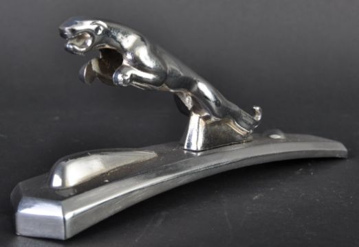Jaguar Mascot - an original vintage Jaguar made Leaper car mascot, mounted on an unusual shaped bonnet mountable base. Similar to the Type 3 mascots, but with some variations. Nose to tail 11cm. 16cm long total.(33)
