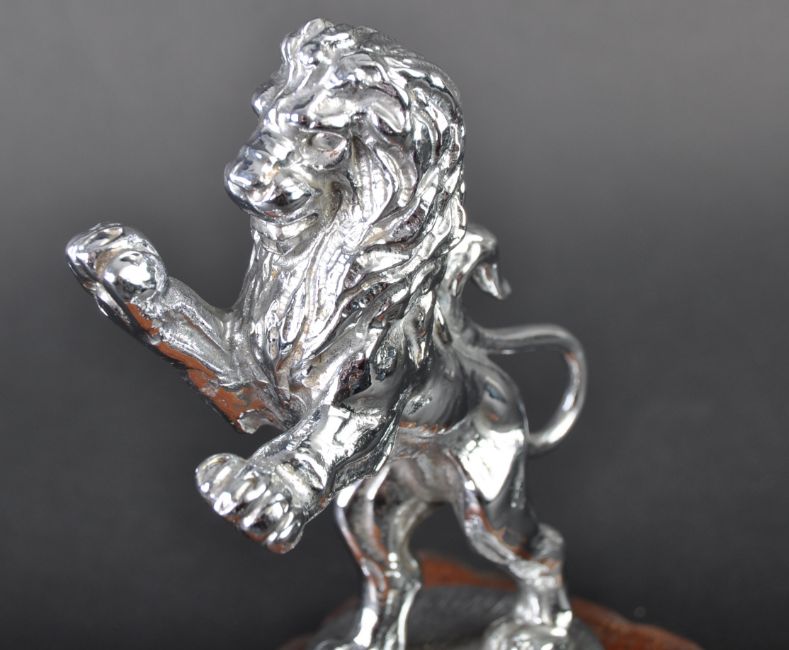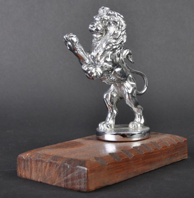 Car Mascot - an original 20th century vintage Franklin Car Club lion car bonnet mascot. Chrome plated, in the form of a standing lion with paw outstretched. Mounted on a wooden display plinth. Measures approx 13cm. (107)