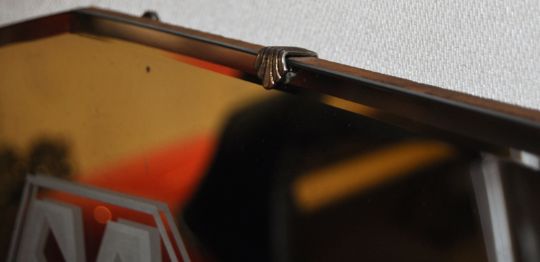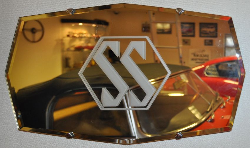 Jaguar - an original vintage 1930s Art Deco wall mirror, with etched notation to the front for ' SS ' (Jaguar SS). Featuring the SS logo lozenge to front. With original Art Deco fan mounting brackets and chain present. Measures approx 56cm long.