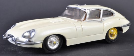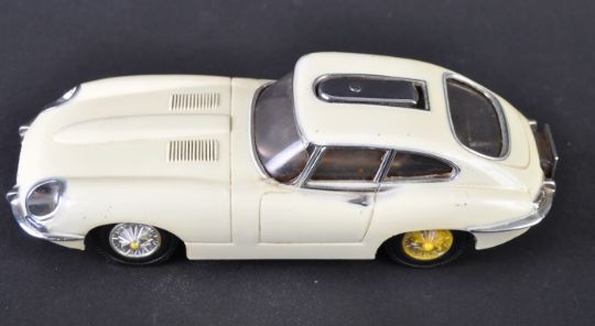 Jaguar - an original vintage desktop cigarette lighter in the form of an E Type Jaguar. White body, with metal base and inners. Faux chrome detailing all over, with instructions decal still present to base. Well modelled lighter on the classic E Type Jag. Measures approx 15cm long. (170)