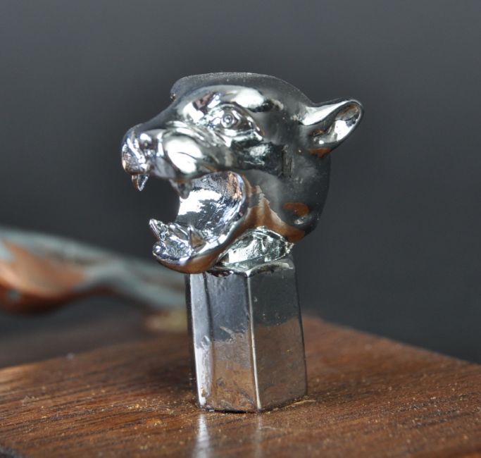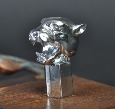 Jaguar Mascots - a collection of x4 original vintage 20th century Jaguar leaper car mascots. Includes two small Jaguar Leapers made for scooters, another similar and a Jaguar head mascot. All mounted on wooden plinth bases. Largest approx 7.5cm long (nose to tail)