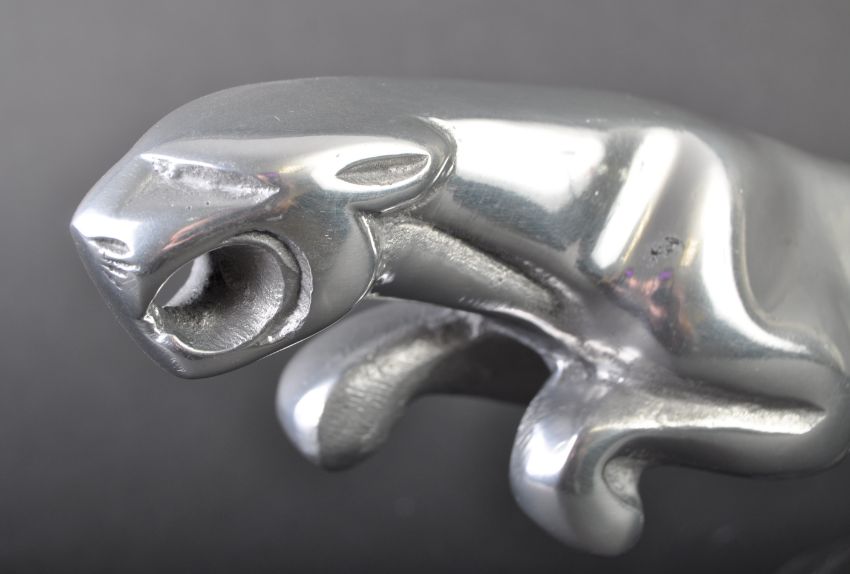 Jaguar - a vintage 20th century Jaguar showroom / dealership aluminium display Leaper mascot statue, or possibly an aftermarket edition. Aluminium construction, mounted on a shaped oval onyx type base. Nose to tail 30cm. (153)