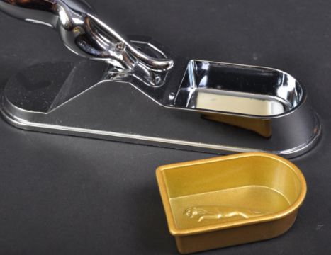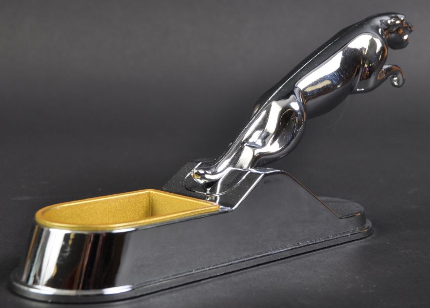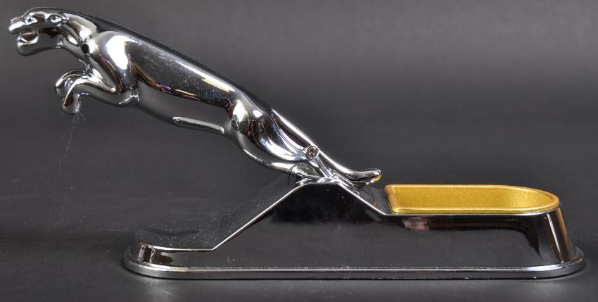 Jaguar - an unusual 20th century vintage Jaguar desktop / stationery paper clip or pin tray with a Leaper mascot to top. Featuring a small removable gold coloured pin tray to base, with chrome mascot to top. Measures approx 21cm. (470)