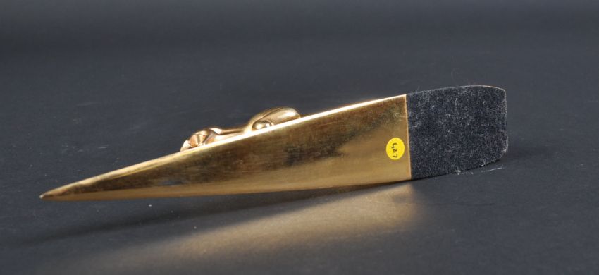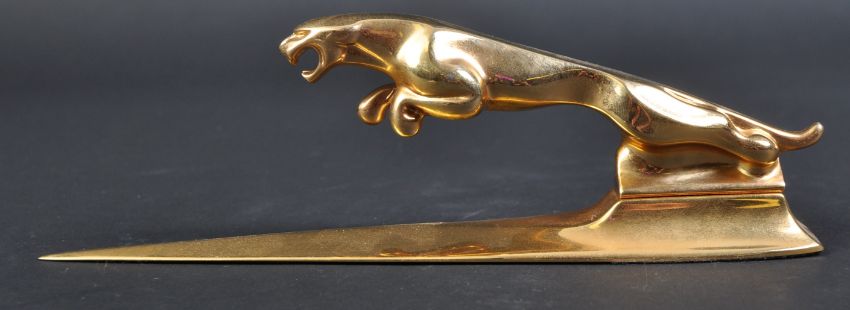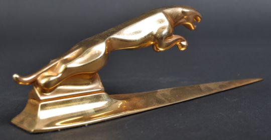 Jaguar - an original vintage 20th century Jaguar Leaper mascot topped brass letter opener. The opener of typical pointed form, with a full size Leaper mascot affixed to top. Impressive piece of desktop stationery. Measures approx 14cm long. (427)