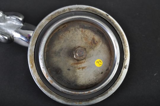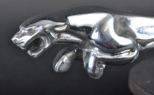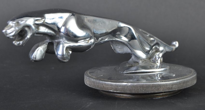 Pre-War Jaguar Mascot - a rare original pre-war metal Jaguar car mascot ' The Leaper '. Being made of lighter form that its later counterparts, weighing just 260g. Typical form with bent rear legs and open mouth. Mounted on an original hood / radiator cap. Nose to tail 20cm. Rare in this condition. (99)