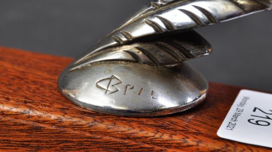 Leaping Jaguar - Casimir Brau - a scarce original Leaping Jaguar car radiator mascot by Casimir Brau, c1925. The nickel-plated bronze mascot in fine Art Deco style, mounted on a circular base signed ' C Brau '. French in origin, and originally retailed by Hermes of Paris. Later version with joined tail. Mounted on a later wooden plinth presentation base. Nose to tail 22cm.
