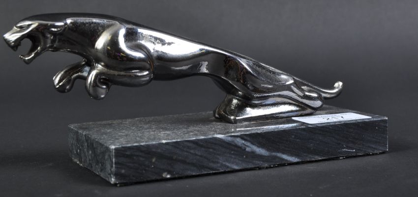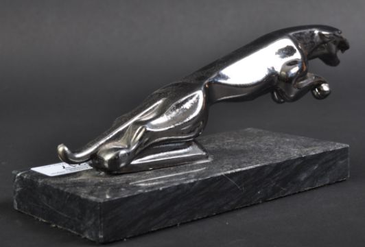 Jaguar - an original vintage 20th century Jaguar Leaper (believed to be from a main dealership) mascot topped desktop ornamental paperweight. Chrome, mounted on a rectangular block chrome base. Measures approx 20cm long. (358)