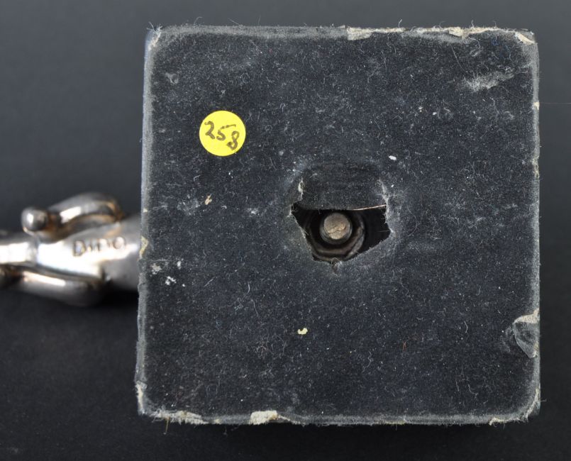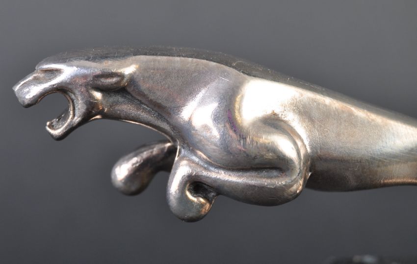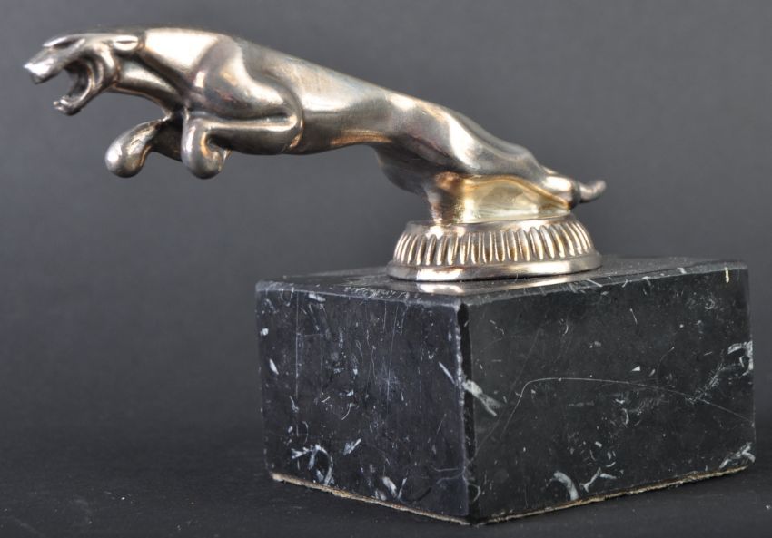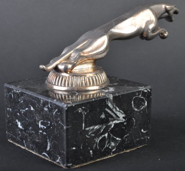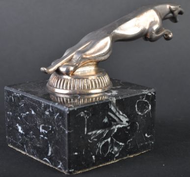 Jaguar Mascot - an original vintage Jaguar Leaper car bonnet mascot of typical form. Mounted atop a squared black marble base. DIDO maker's marks to underside of mascot. Nose to tail 13cm. (258)