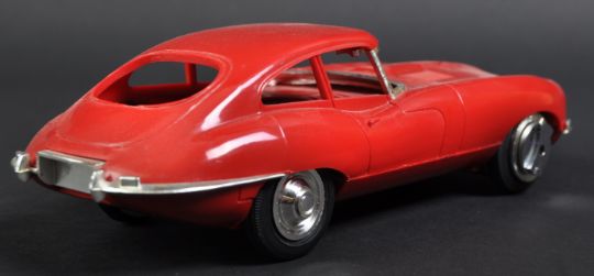 Jaguar - a scarce 1960s Japanese made portable battery powered transistor radio in the form of an E Type Jaguar. Plastic E-Type casing in red, with detailed headlights and chrome effect decoration. Radio to interior. Measures approx 21cm long. (389)