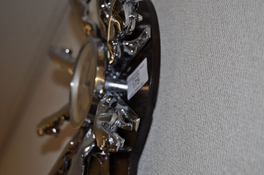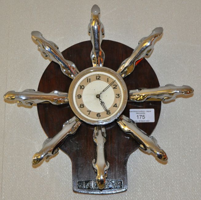 Jaguar - a unique 20th century vintage wall clock decorated with x8 original Jaguar Leaper mascots surrounding the central clock dial. Jaguar logo / emblem to base. A quirky and unusual piece of Jaguar memorabilia. 30cm tall.
