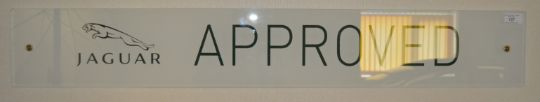 Jaguar - an original Jaguar dealership / showroom sign ' Jaguar Approved '. Perspex / plastic construction, with Jaguar emblem to left and notation to right. Mounting holes present. Measures approx 105cm long.