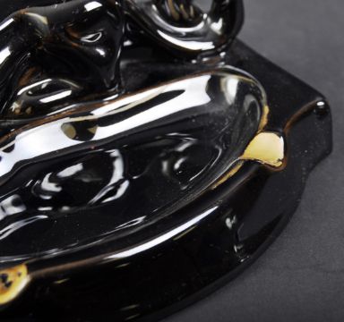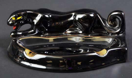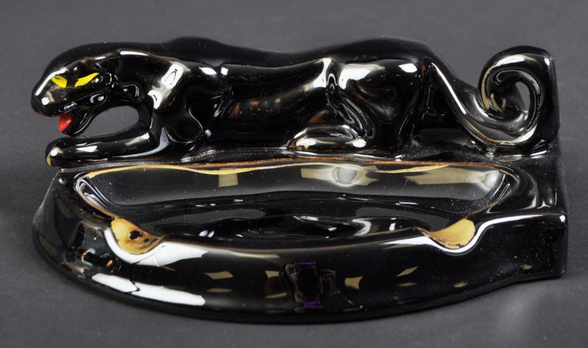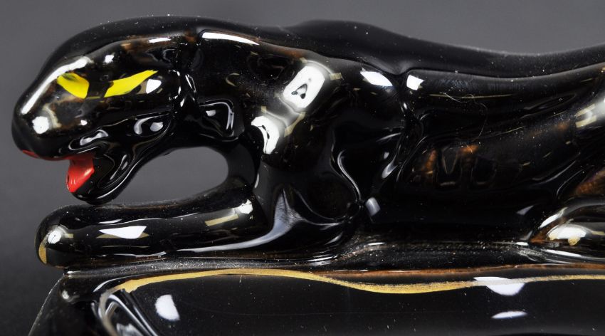 Jaguar - a vintage 20th century American made ceramic / china ashtray. Decorated with a Jaguar style prowling big cat to top, mounted on the shaped ceramic cigarette ashtray / pin tray base. With some painted detail. Undamaged. Measures approx; 17cm long. (382)