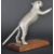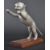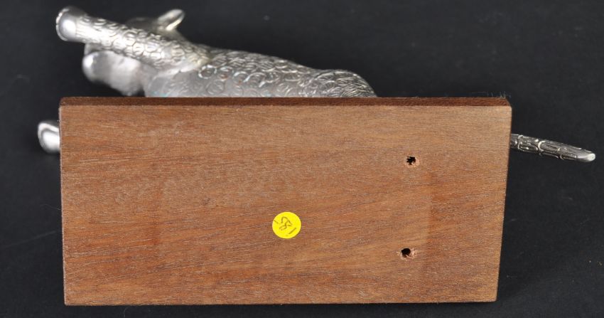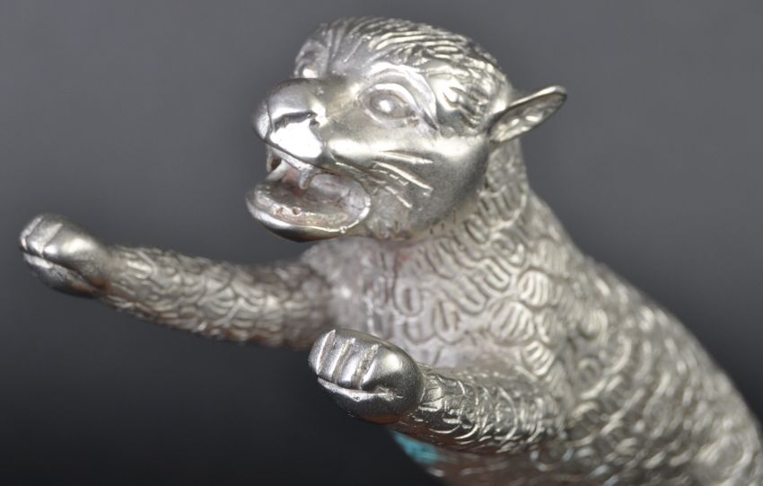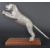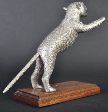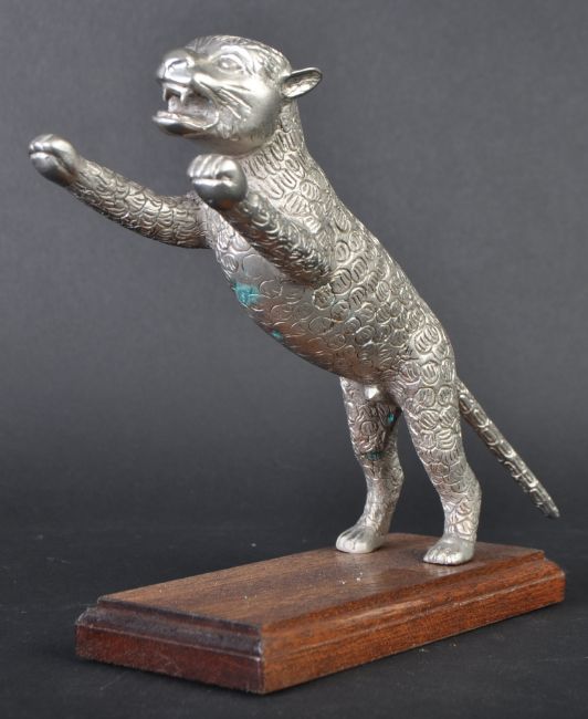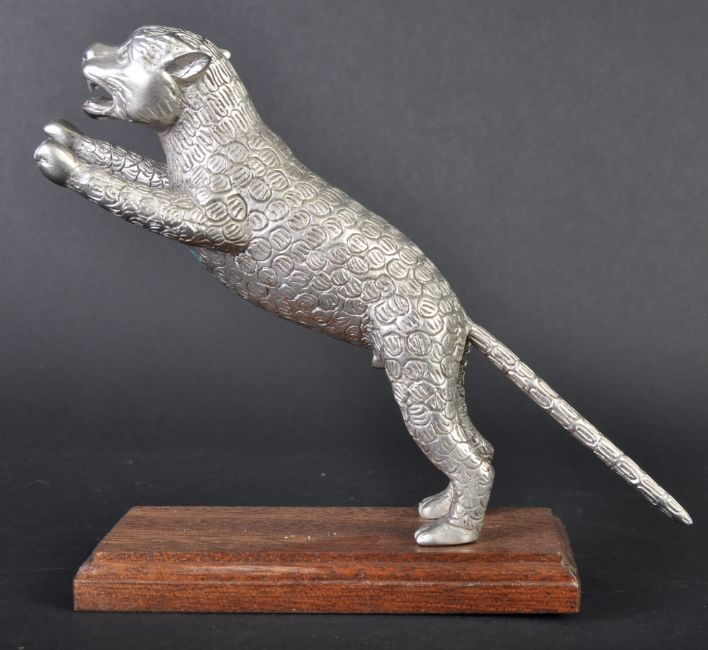 Leaping Cat Mascot - an original 20th century American made Desmo type leaping cat car bonnet mascot. Very similar to the Desmo kind, but of a slightly different form with a proudly standing cat and an elongated straight tail. Mounted on a wooden display base. Nose to tail 20cm. (185)