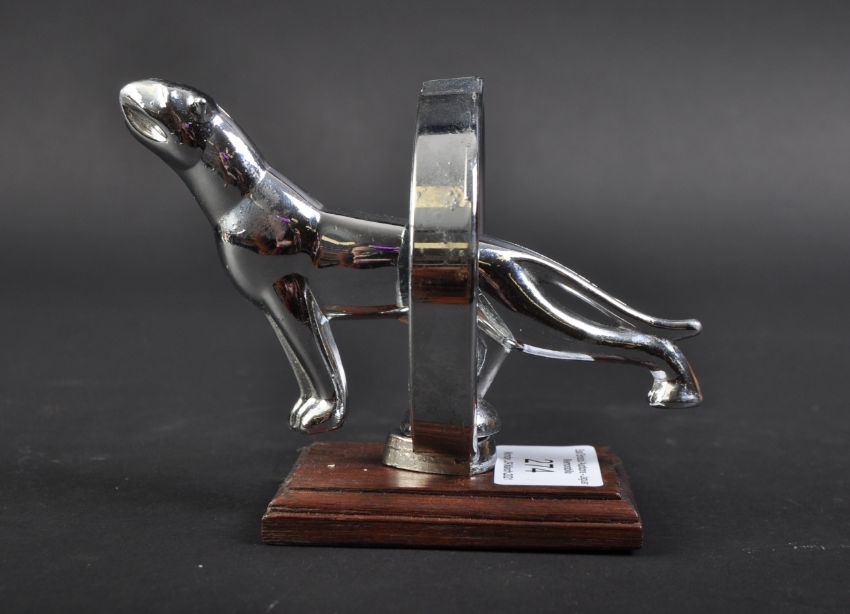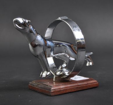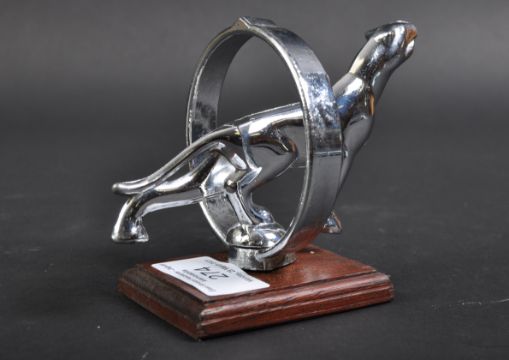 Jaguar Mascot - an original vintage American Jaguar Leaper type upright hooped / ringed car mascot, with a Jaguar to the centre. Mounted on a wooden display plinth. Nose to tail 12cm. (408)